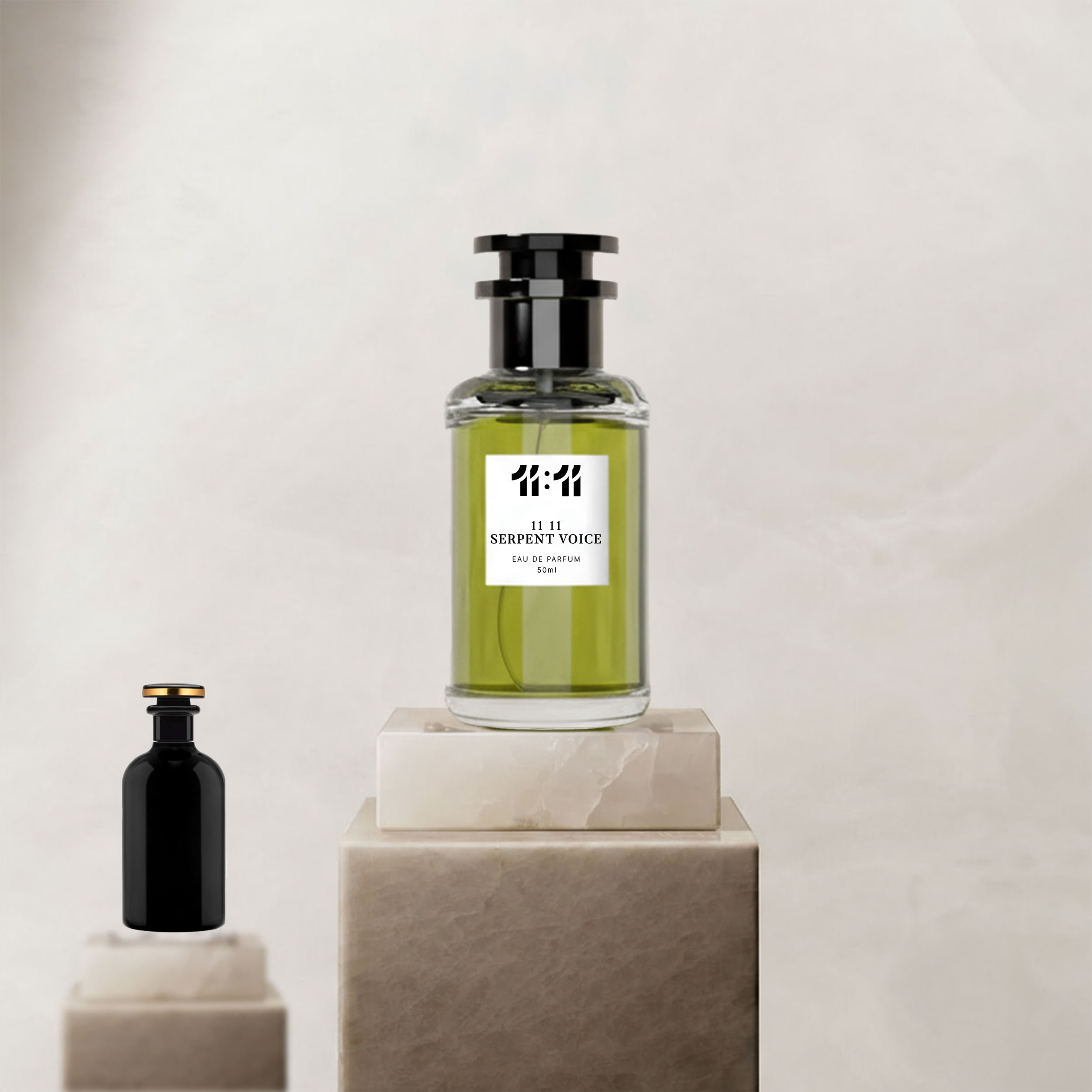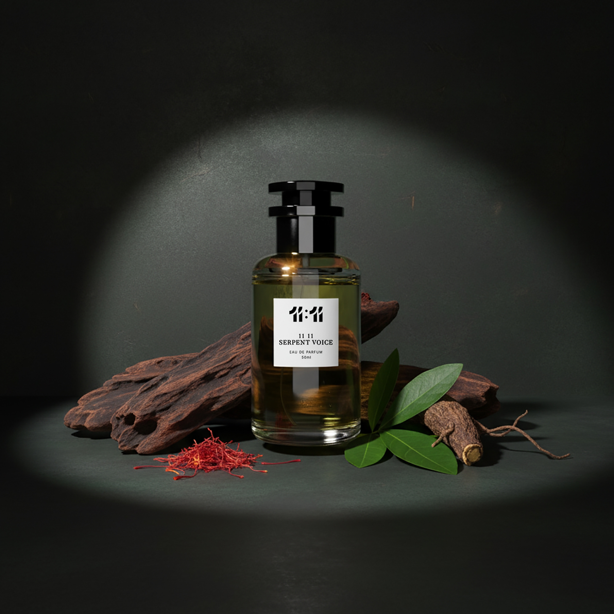 عطر 11:11 سيربنت فويس هو عطر قوي وآسر يقوم على العود الداكن المدخن. تضيف لمسات الزعفران الغريبة والباتشولي الترابي عمقاً وغنىً، مما يصنع رائحة ساحرة تخطف الأنفاس بجاذبية لا تقاوم.