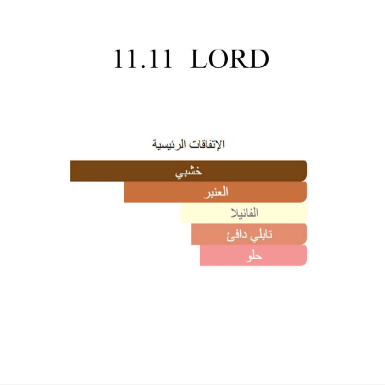 11 11 لورد هو عطر فاخر وراقٍ يمزج بين العود الدخاني والعنبر الغني وحبوب التونكا الدافئة. يجسّد هذا العطر المميز القوة والرقي، وهو مثالي لأولئك الذين ينضحون بالأناقة الخالدة.