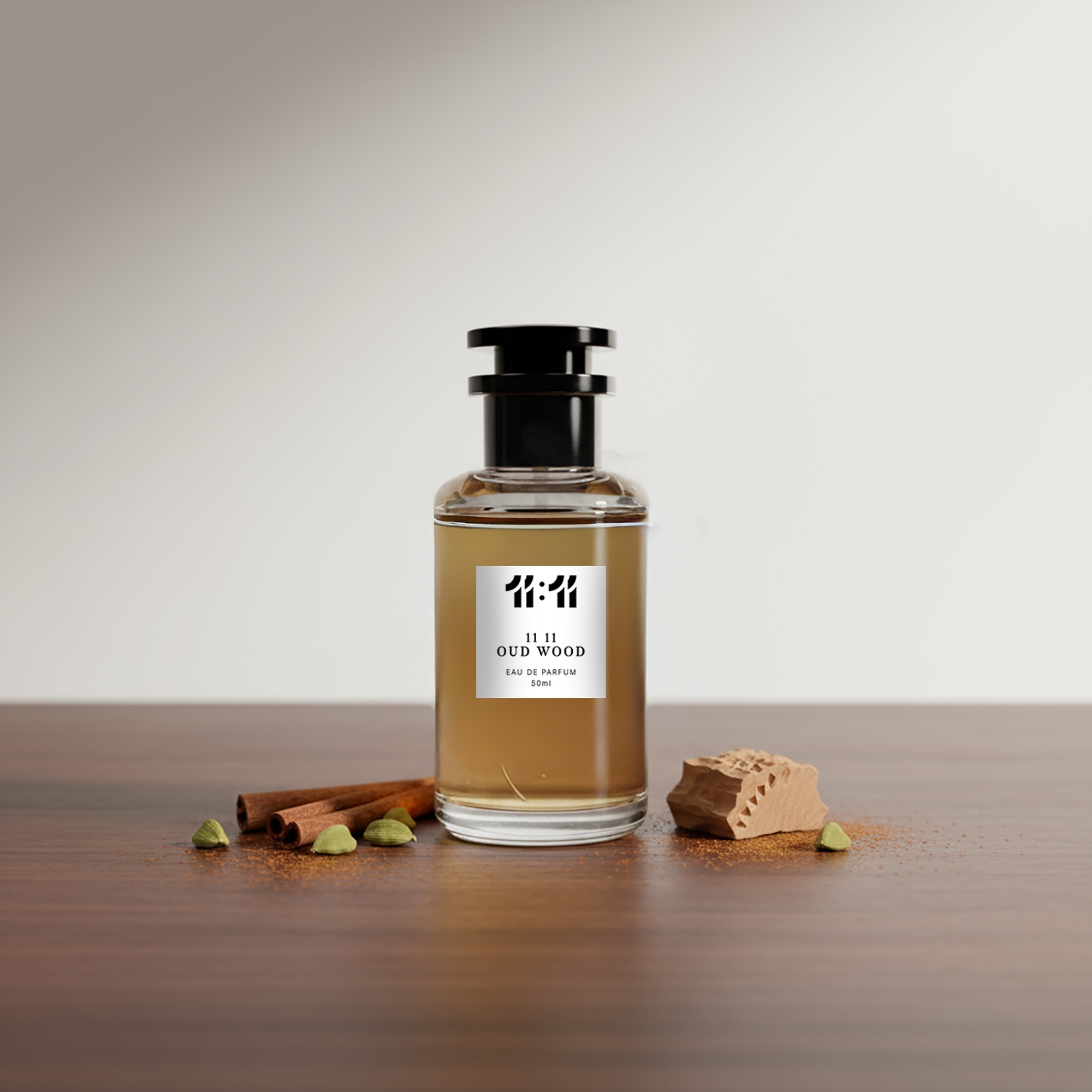 عطر 11:11 عود وود هو عطر غني وغريب يمزج بين العود المدخن، والتوابل الدافئة، وخشب الصندل الكريمي. تجسد هذه الرائحة الفاخرة الغموض والرقي، ومثالية لمن يقدّرون الأناقة الخالدة.