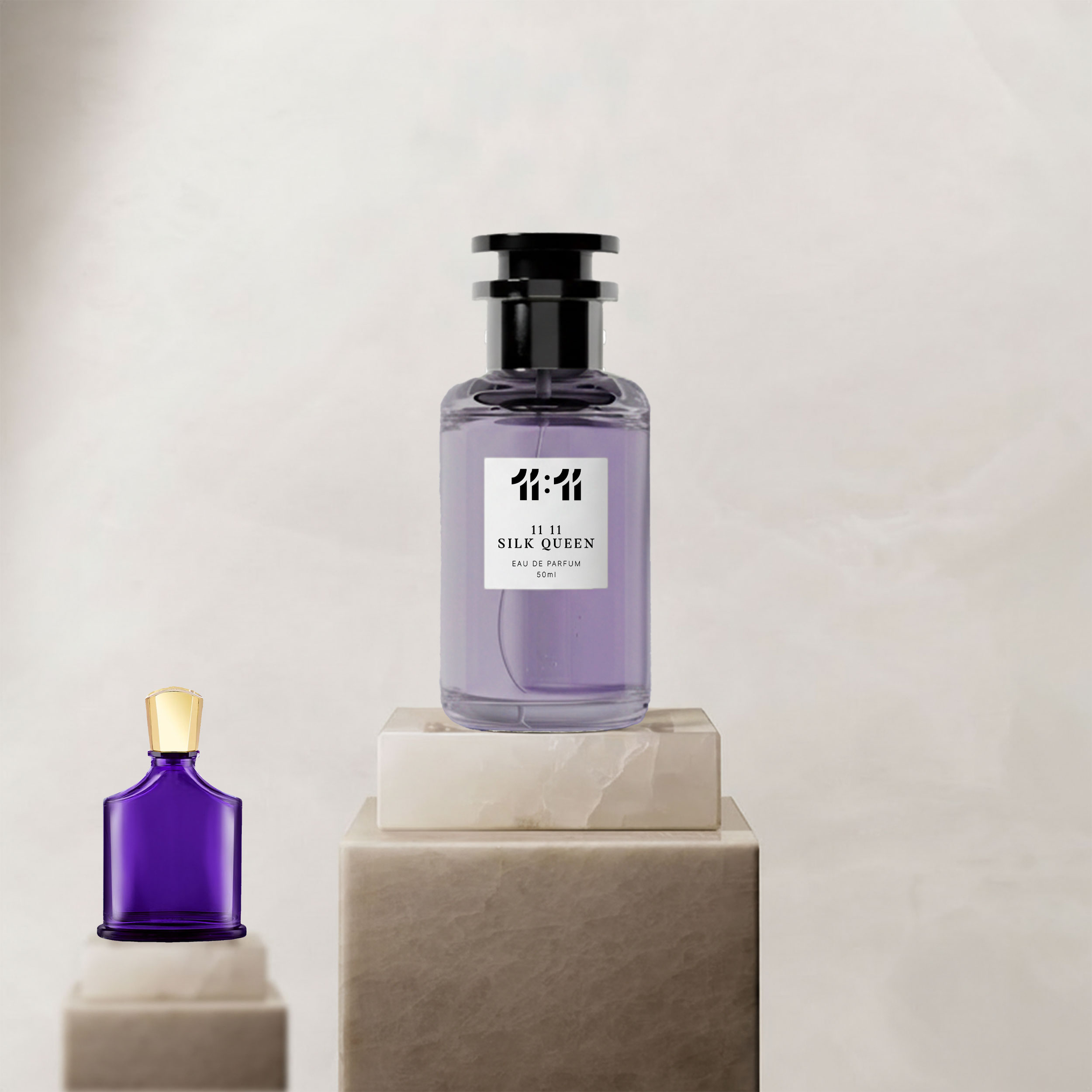 عطر 11:11 سيلك كوين هو عطر أنيق ورومانسي يمزج بين الورد الرقيق، والبنفسج المنعش، والمسك الدافئ. تجسد هذه الرائحة الساحرة الرقي والأناقة، ومثالية للأناقة الخالدة.