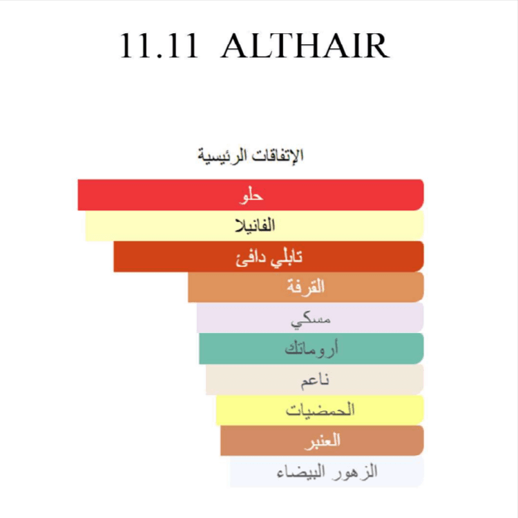 وشحن مجاني11 11 ئەلتایر بووەیەکەی دەڵەو و لاکچەرێیە کە ڤانیلای کرێمی، ئەمەری گەرموو و مۆشکی سپیی نازناز تێکدەهێنێت. ئەم بۆنەی دڵڕاو، نیشانەیەکی جوانی و هەستیاریدا دابڕاوە، گونجاوە بۆ کاتە نەبیرەوەکان.