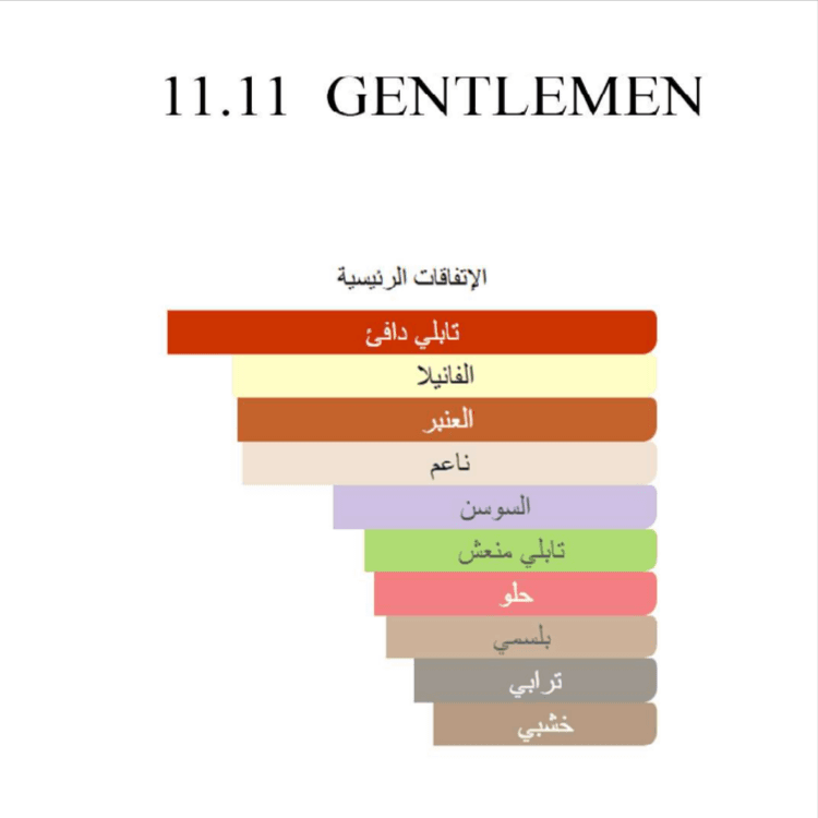 وشحن مجاني11 11 جەنتلمەن بۆنێکی پاڵاوتە و ئاڵۆزە کە بیبەری ڕەشی قەڵەم و ڤانێلای گەرم و ئیریسی نەرم تێکەڵ دەکات. ئەم بۆنە ڕەسەنە متمانە و سۆزێکی بێ کات بەرجەستە دەکات، تەواو گونجاوە بۆ بەڕێزە مۆدێرنەکە.