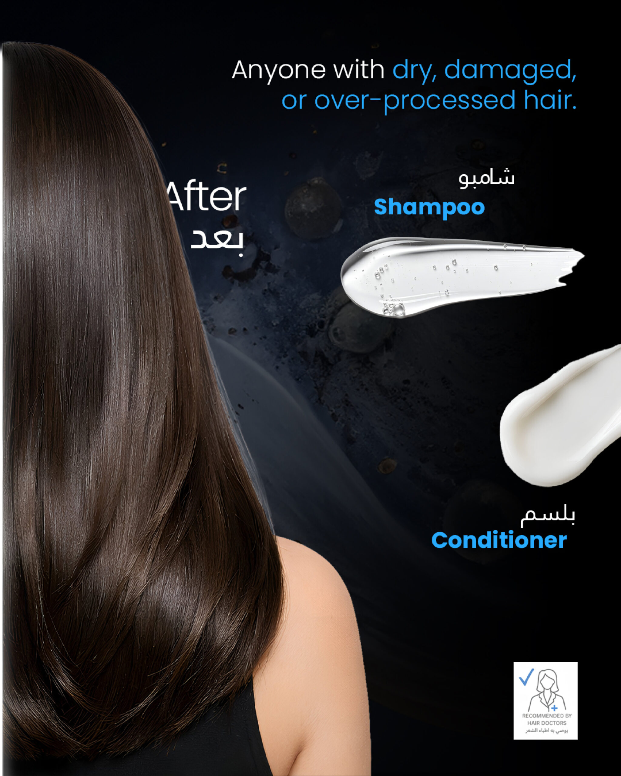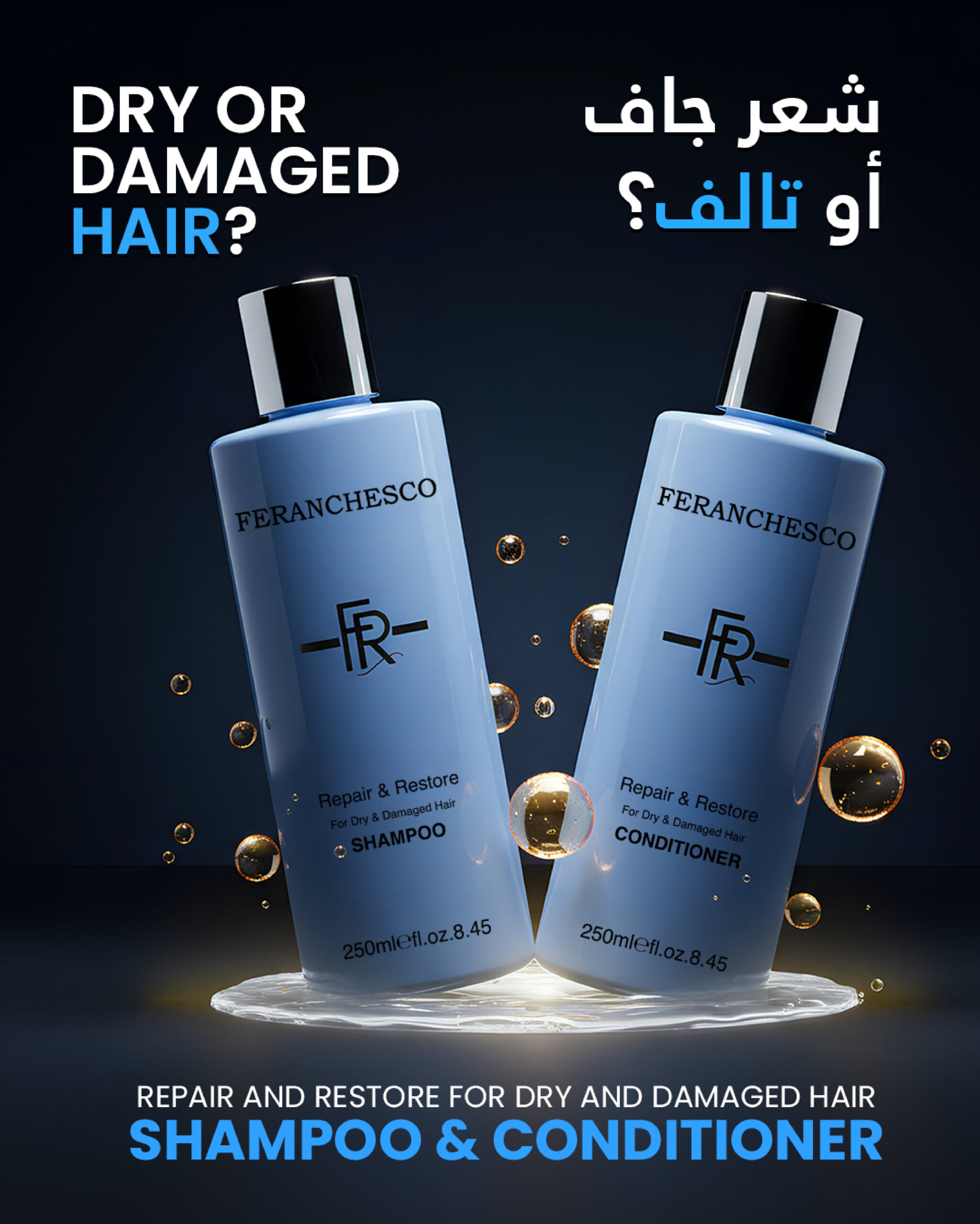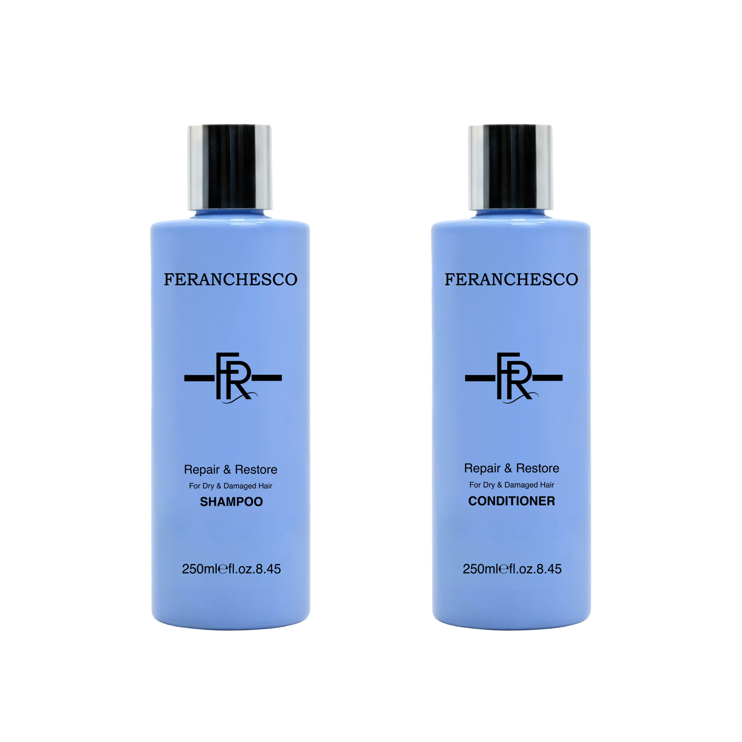 Restore strength and softness with the Feranchesco Duo for Damaged Hair. This nourishing shampoo and conditioner system helps repair dry, brittle hair while deeply hydrating and strengthening each strand. Enriched with coconut oil, macadamia oil, argan oil, biotin, and panthenol, it helps transform rough, damaged hair into smoother, healthier-looking hair.